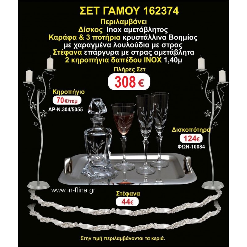Η τιμή περιλαμβάνει 2 κηροστάτες δαπέδου (ινοξ,μπρονζέ η σκουριά) στέφανα επάργυρα αμετάβλητα,δίσκος ινοξ αμετάβλητος,μποτίλια κρυστάλλινη,3 ποτήρια κρυστάλλινα.
