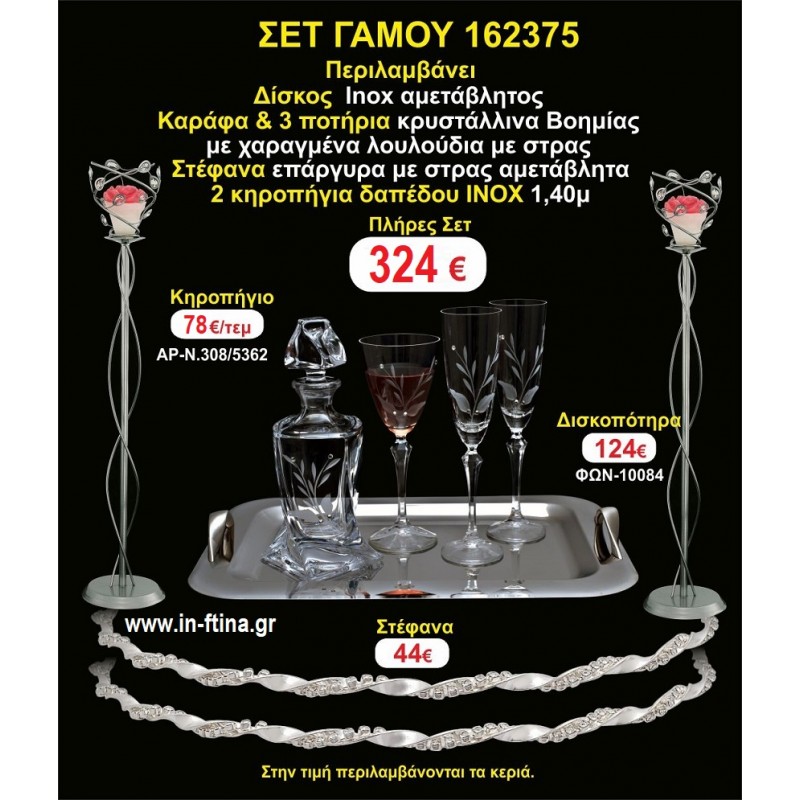 Η τιμή περιλαμβάνει 2 κηροστάτες δαπέδου (ινοξ,μπρονζέ η σκουριά) στέφανα επάργυρα αμετάβλητα,δίσκος ινοξ αμετάβλητος,μποτίλια κρυστάλλινη,3 ποτήρια κρυστάλλινα.