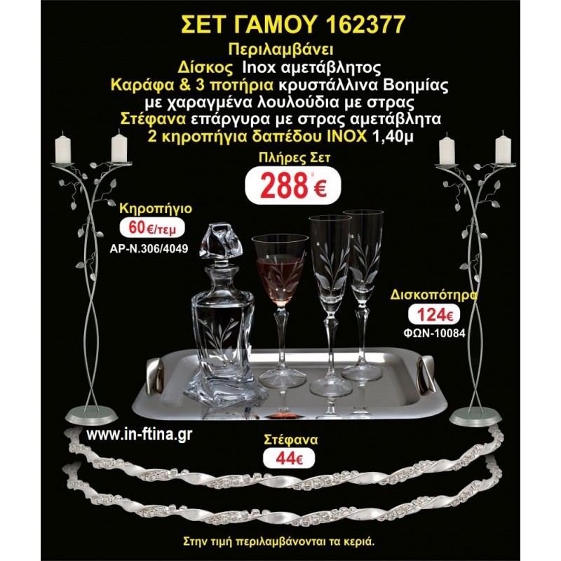 Η τιμή περιλαμβάνει 2 κηροστάτες δαπέδου (ινοξ,μπρονζέ η σκουριά) στέφανα επάργυρα αμετάβλητα,δίσκος ινοξ αμετάβλητος,μποτίλια κρυστάλλινη,3 ποτήρια κρυστάλλινα.