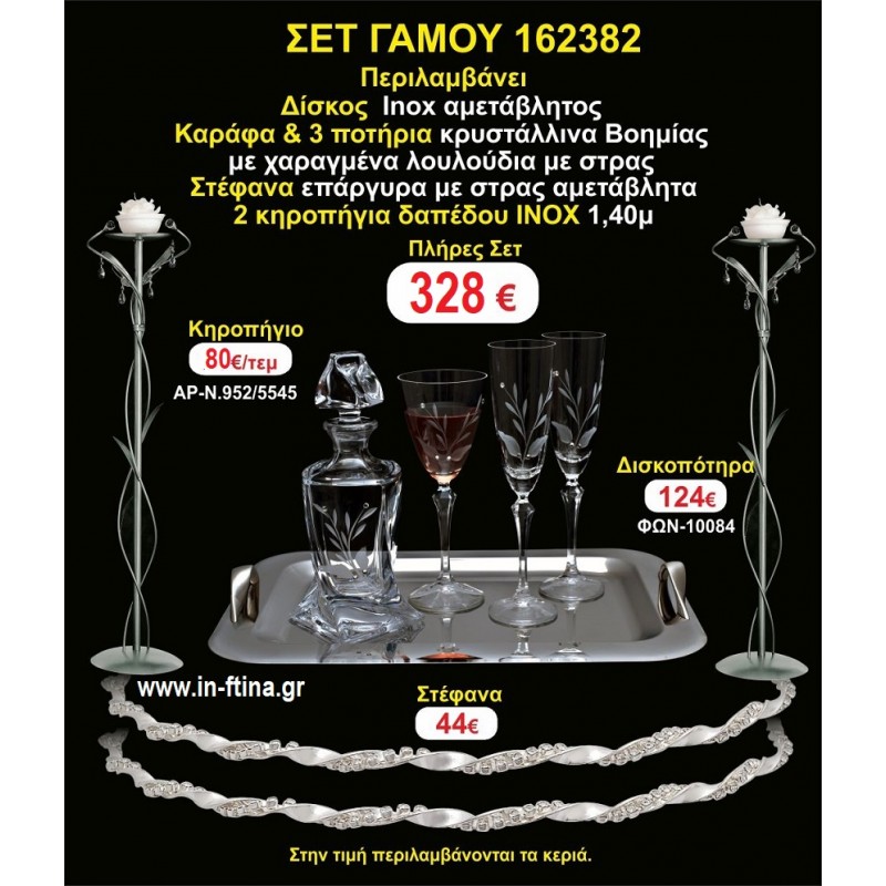 Η τιμή περιλαμβάνει 2 κηροστάτες δαπέδου (ινοξ,μπρονζέ η σκουριά) στέφανα επάργυρα αμετάβλητα,δίσκος ινοξ αμετάβλητος,μποτίλια κρυστάλλινη,3 ποτήρια κρυστάλλινα.