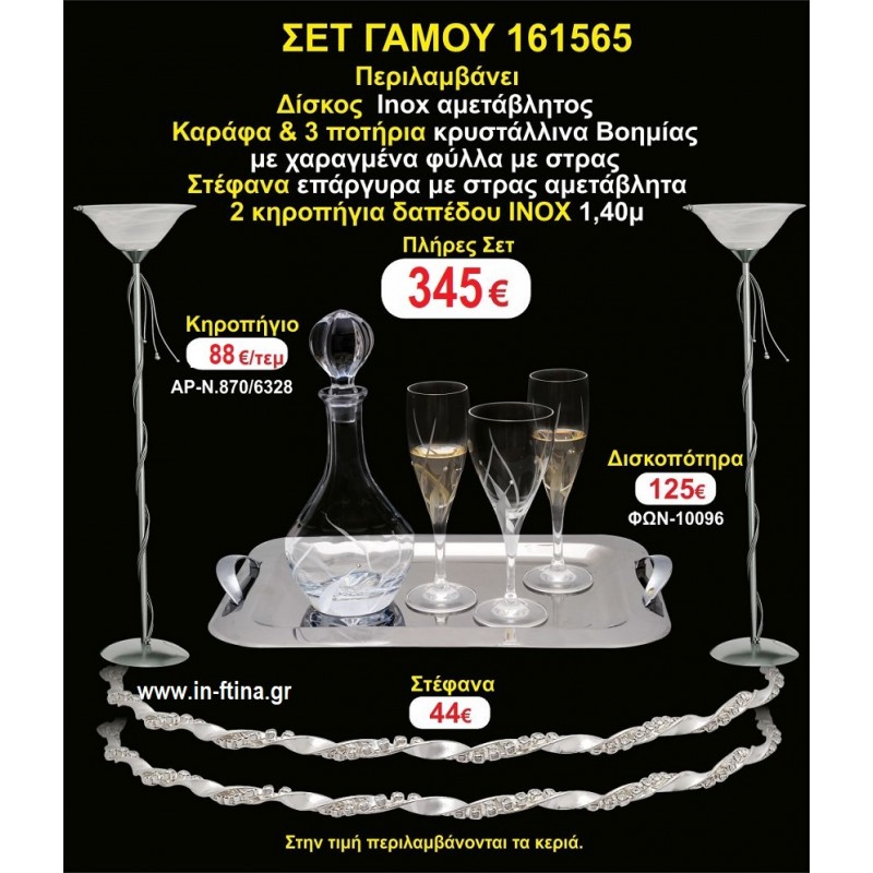 Η τιμή περιλαμβάνει 2 Κηροστάτες δαπέδου (ινοξ,μπρονζέ η σκουριά) στέφανα επάργυρα αμετάβλητα,δίσκος ινοξ αμετάβλητος,μποτίλια κρυστάλλινη,3 ποτήρια κρυστάλλινα.