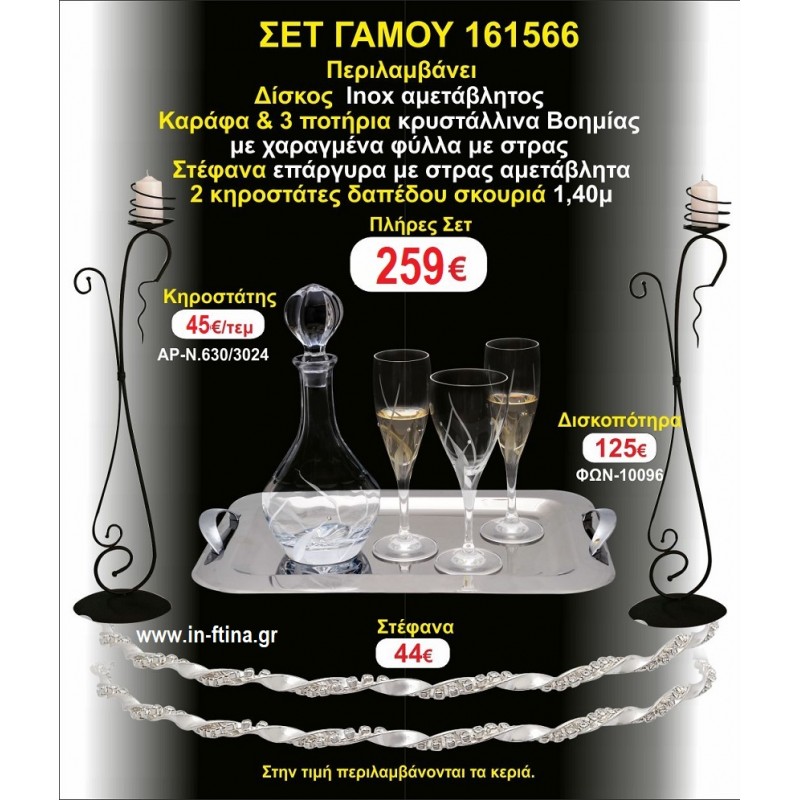 Η τιμή περιλαμβάνει 2 Κηροστάτες δαπέδου (ινοξ,μπρονζέ η σκουριά) στέφανα επάργυρα αμετάβλητα,δίσκος ινοξ αμετάβλητος,μποτίλια κρυστάλλινη,3 ποτήρια κρυστάλλινα.